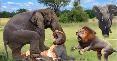 糟糕的!憤怒的大象媽媽衝上前將獅子勒了以拯救她的小牛 - 獅子大戰大象