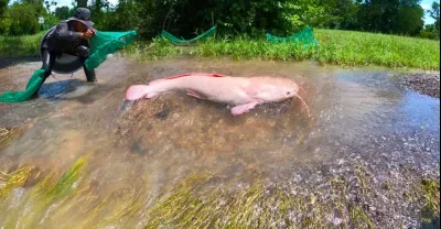 amazing fishing! a lots of strange Redfish on the road when flood water catch by fishing tools