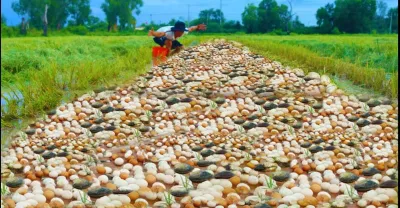 wow wow wow! pick a lots duck eggs after farmer harvest rice in field by hand a fisherman