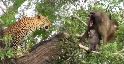 我的天啊。在狒狒媽媽的幫助下,狒狒寶寶幸運地逃脫了豹子的襲擊