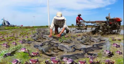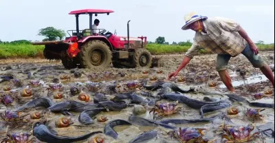漁夫技能捕捉田間螃蟹!拖拉機犁耕後,驚人的釣魚