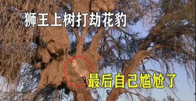 獅王上樹搶奪花豹的食物,嚇得花豹不敢亂動,最後自己卻尷尬了
