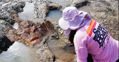 2斤豬肝誘來海域「巨虎」,又大又肥丑的嚇人,皮皮直呼:我的媽呀