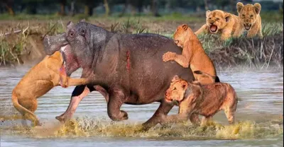 河底大戰!當他們在河裡發生衝突時,巨型河馬咬掉了獅子王的頭