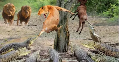 痛苦的獅子被飢餓的鱷魚殘忍地襲擊以竊取獵物和壯觀的反擊