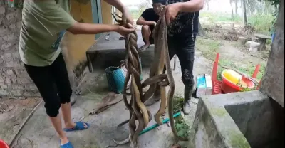 看到水箱裡有20條巨型眼鏡蛇,年輕人驚慌失措,呼救