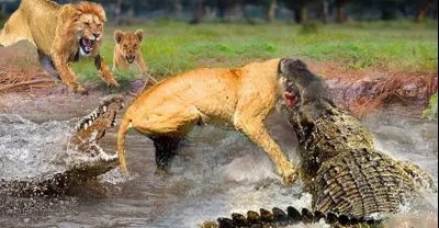 糟糕的!兇猛的鱷魚衝上去咬獅子的頭來偷獵物——野狗、獵豹……