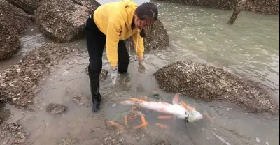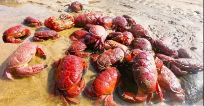 海邊爛網困住大魚,周圍不少螃蟹等著分食大魚,不料被漁妹搶了先