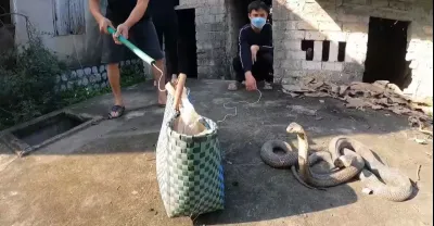 幫助2個年輕人在水箱上捕捉3條躺在陽光下的眼鏡王蛇