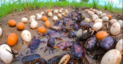 哇太棒了!下雨後在田裡抓到很多螃蟹和蛋鴨 漁夫用手抓