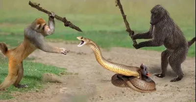 在老鼠媽媽恐慌逃跑後,猴子從蛇吞下的小老鼠中救出