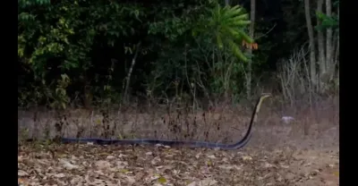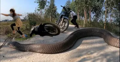 一個年輕人發現一條眼鏡王蛇爬過馬路,他放棄了他的摩托車逃跑了。