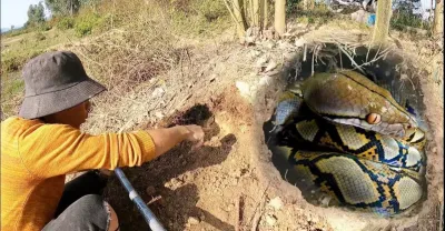 男孩正在放牧一頭水牛,突然一條巨大的眼鏡王蛇從後面襲擊了他。