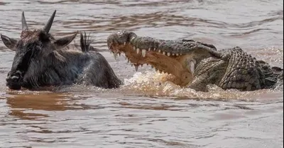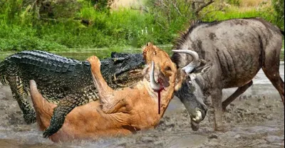 牛羚沒看到鱷魚來了,看看發生了什麼,致命的穿越