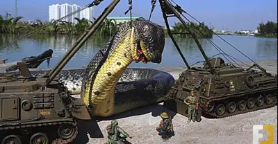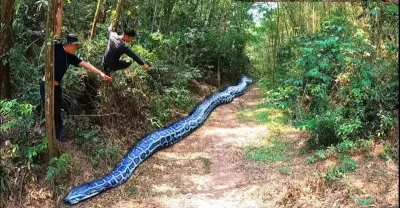 嚇壞了一條300公斤的巨蛇衝下來攻擊森林中的2名年輕人