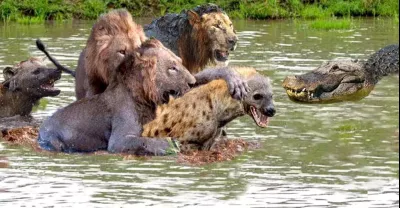 Hyena Confronts Crocodile, Lion Who's the Hungry God When Animal Kings Compete
