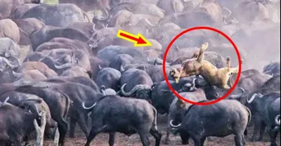 實拍!落單獅子捕殺水牛,卻被水牛群瘋狂踩踏,屍體多次被拋向空中!
