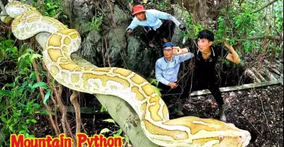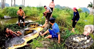 5 名獵人使用勇敢的鬥牛犬和電鋸捕獲 2 條巨蟒在椰子樹中產卵