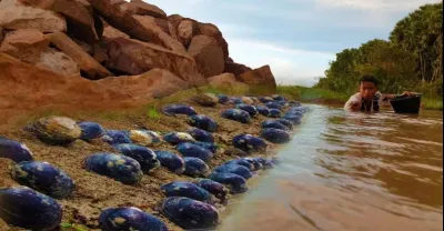 Wow amazing today a fisherman pick clams in water flow from field into lake after have big rain