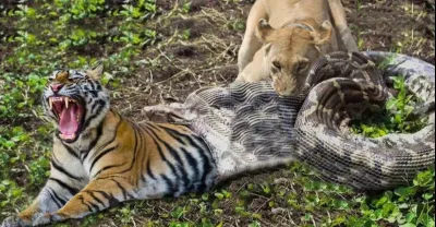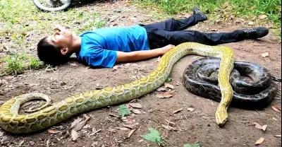 可怕,拯救被兩條巨蟒襲擊的年輕人