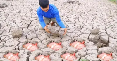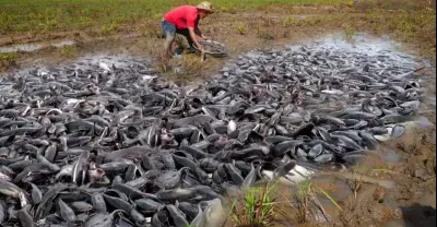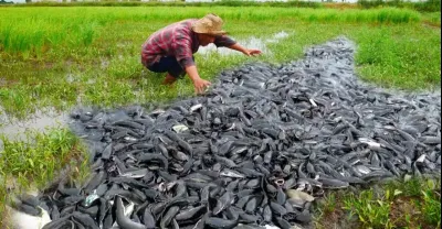 best fishing video! a fisherman a lots of catch catfish in dry water at field by skill hand