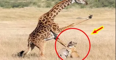 #長頸鹿 一腳半噸怒踢 #獅子,卻因過度緊張抬錯腿,將幼崽踢下懸崖!