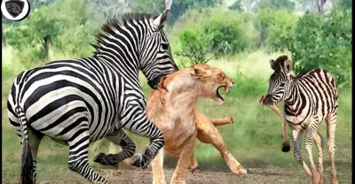 斑馬媽媽打獅子,小斑馬衝進來咬掉獅子尾巴