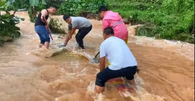 這樣抓魚才過癮,一場大雨魚塘衝出很多大魚,村民一抓就100多斤