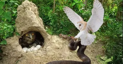 這很棒!貓頭鷹決戰與蛇到最後一口氣保護巢中的孵化鳥