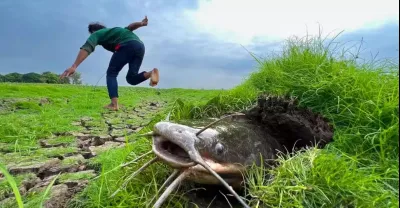太奇妙了!現在在旱季用手抓草下的地下怪物鯰魚