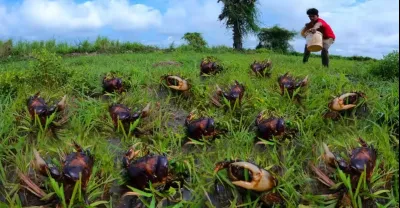 哇驚人的釣魚!一個漁夫在田野的草地下用最好的手抓了很多螃蟹