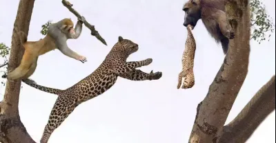 我的天啊!狒狒綁架幼豹,母豹衝上前向狒狒報仇