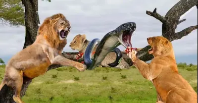 我的天啊!獅子媽媽在攻擊眼鏡王蛇拯救她的幼崽時悲慘_獅子與蛇
