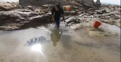 礁石區趕海,妹子發現地面有猛貨爬過的足跡,翻看一看竟是大蟹王