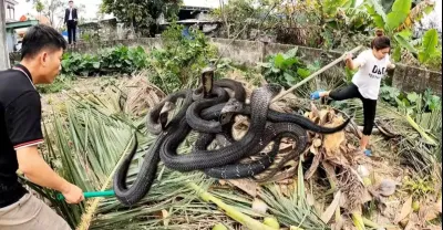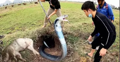 2人圍著巨型眼鏡王蛇攻擊田野裡的奶牛