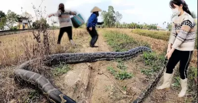 母女發現一條200公斤重的巨蛇爬過馬路後逃跑