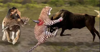 Lion Catch and Kill Leopard Cub When Mother Leopard Hunting Wildebeest – Leopard vs Lion, Wildebeest