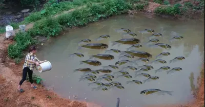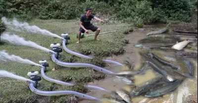 Wild Fishing Exciting, Easy Use Two Large Pump Water out of The Large Puddle Catch Many Fish