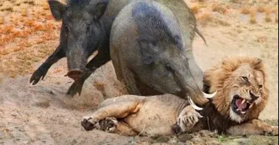 奇怪疣豬媽媽咬獅子的頭來救她的孩子 - 疣豬對豹,鬣狗