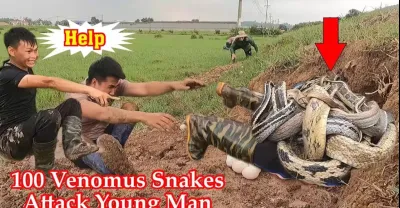 嚇壞了,一個年輕人被100條毒蛇襲擊,因為它從巢穴中取卵