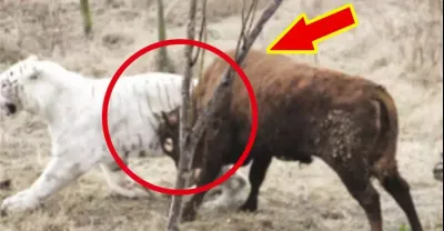 400多斤白虎攻擊700斤黃牛,反被黃牛用角撞,一直退到角落!虎王雄風不再!