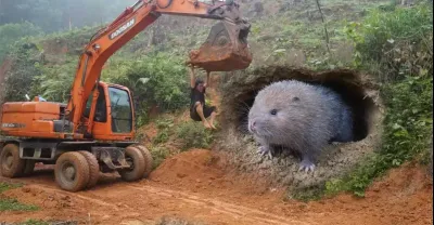 大型挖掘機工作遇見森林老鼠/使用挖掘機挖洞抓森林老鼠