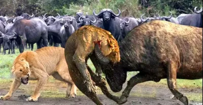 太棒了……兇猛的水牛為了拯救他的同類而瘋狂地戰鬥並殺了獅子 - 水牛大戰獅子
