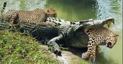 鱷魚過河等待獵豹沼澤王的艱辛生活 - 捷豹與凱門鱷