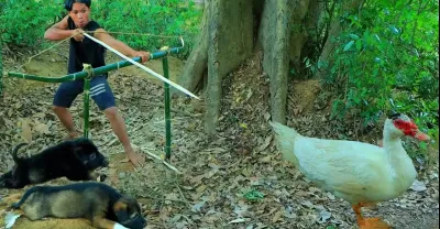 熱帶雨林求生人機靈犬用竹弓射鴨吃鴨