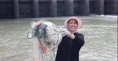 大浪把爛網衝到海邊,漁妹趕海碰巧路過,「海貨」多到拿不動
