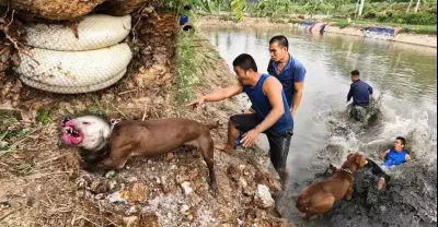 大貨躲在渾坑偷吃,力大無比拽不動,皮皮直呼:老娘跟你拼了!