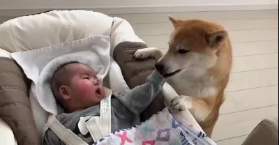 寶寶睡前啼哭不止,柴犬看到趕緊安慰,滿眼儘是母愛!