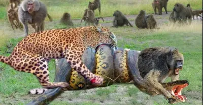 蟒蛇獨自與狒狒和豹子搏鬥,必有慘痛的結局