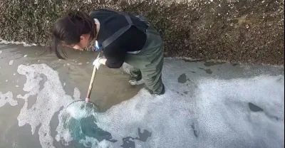 皮皮發現養殖場排水口,流出很多食物殘渣,在這裡趕海特別好抓
